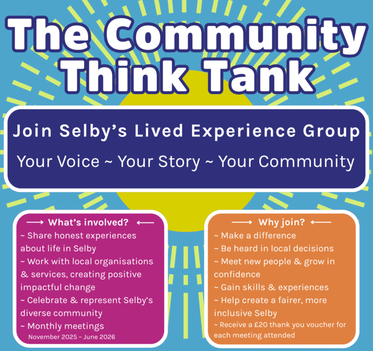 We’re delighted that in 2025 we have embarked on the next phase of this work, translating the community research into action, creating The Community Think Tank, a new lived experience group for Selby. The Community Think Tank is made up of people who live in Selby and have real-life experience of local issues – such as housing, health, caring, education, environment, employment, or community life.